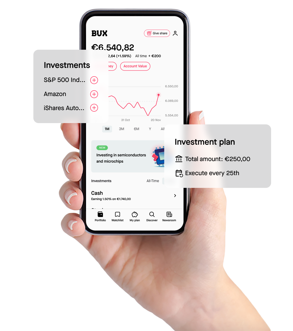 With BUX, you don’t need a lot of money to get started. Try our €0 Investment Plan or our zero-commission orders.