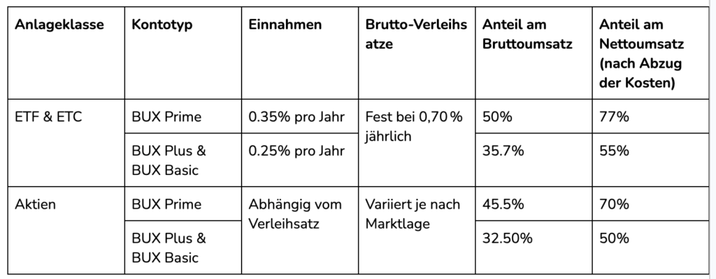 Beim Verleihen von ETFs, ETPs und ETCs bedeutet dies, dass BUX Prime-Kunden 50 % des von den Entleihern gezahlten Bruttosatzes erhalten, und BUX Plus- sowie BUX Basic-Kunden 35,75 % des Bruttosatzes auf alle ETFs in ihrem Portfolio erhalten.