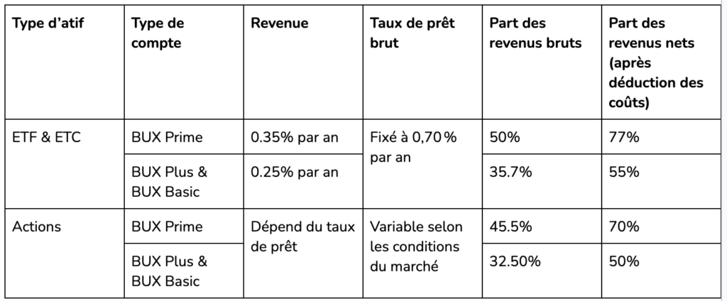 Pour le prêt d’ETF, ETPs et d’ETC, cela signifie que les clients BUX Prime reçoivent 50 % du taux brut payé par les emprunteurs, et que les clients BUX Plus et BUX Basic reçoivent 35,75 % du taux brut sur tous les ETF de leur portefeuille.