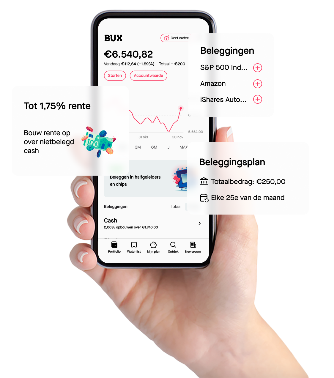 Elk accounttype bevat de €0 BUX Beleggingsplan-functionaliteit om periodiek te beleggen. Met BUX Plus beleg je daarnaast voordelig in aandelen en ETF’s en ontvang je 1,5% rente op je niet-belegde geld. Met BUX Prime profiteer je van onze laagste kosten, 1,75% rente en toegang tot door experts samengestelde Plannen. Ontdek alle BUX kosten hier.