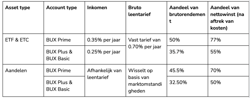 - Voor het uitlenen van ETF’s en ETFC’s ontvangen BUX Prime klanten 50% van het bruto leentarief, en BUX Plus en BUX Basic klanten 35,75%.