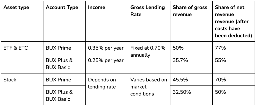 For lending ETFs, ETPs and ETCs this implies that BUX Prime clients receive 50% of the gross rate paid by borrowers, and BUX Plus and BUX Basic clients receive 35.75% of the gross rate on all ETFs in their portfolio.